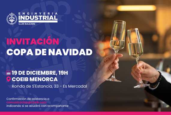 El Colegio Oficial de Ingeniería Industrial de Baleares tiene el honor de invitarle a la tradicional copa de Navidad, que se celebrará el viernes, 13 de diciembre de 2024, a las 19:00 horas en la sede del COEIB (COEIB: C/ Carlos I, n° 2 de Palma).